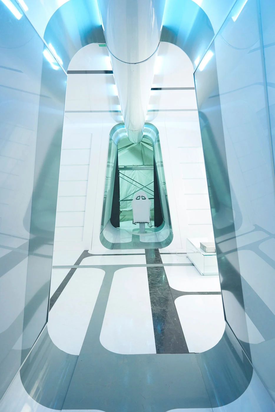 The interior of these ships is sparse and brightly lit.