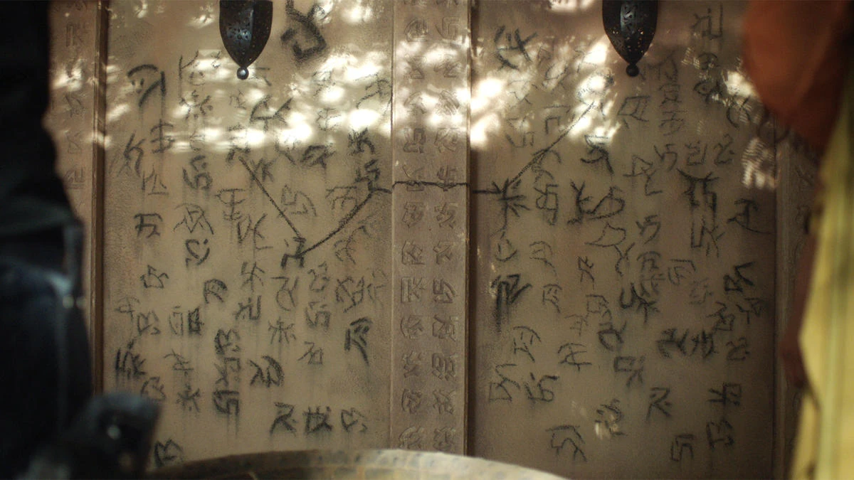 The series art department designed the Old Word language written by Olan on the walls of the monastery.